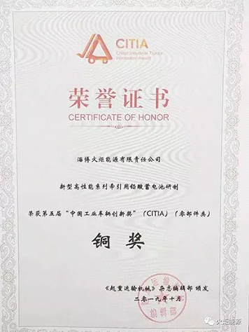 10月18日,中國工程機械工業(yè)協會工業(yè)車輛分會七屆三次會員代表大會暨2019年年會在河北唐山勝利召開。會議對前期評審的第五屆“中國工業(yè)車輛創(chuàng)新獎”(CITIA)(零部件、管理和服務類)獲獎企業(yè)進行了表彰,風帆火炬公司作為十一家獲獎企業(yè)之一,參評的“新型高性能系列牽引用鉛酸蓄電池研制”項目榮獲銅獎,成為蓄電池類項目唯一獲獎廠家。