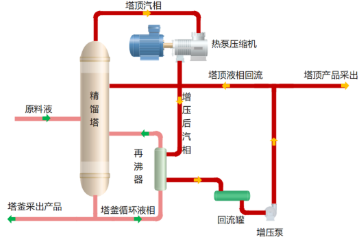 該項目使用熱泵壓縮機(jī)對精餾塔頂氣進(jìn)行增壓,以提高其溫度品位,再將其送往塔釜再沸器作為熱源使用,替代原本蒸汽熱源,從而大幅減少一次蒸汽以及塔頂冷卻水耗量,從工藝上實現(xiàn)精餾過程的節(jié)能減碳。