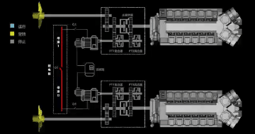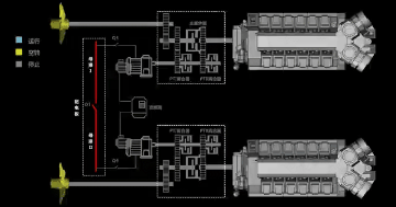“海巡06”船主動力系統(tǒng)采用七一一所自主研發(fā)的柴電混合動力控制系統(tǒng),配有智能化PTO/PTI切換控制裝置,便于船員切換進入一機雙槳模式,即其中一舷的主機在驅(qū)動螺旋槳同時驅(qū)動軸帶電機發(fā)電(運行在PTO模式),通過配電板供電給另一舷軸帶電機(運行在PTI模式)驅(qū)動螺旋槳。這樣的設(shè)計有利于在船舶低速航行時提高主機負(fù)荷,降低主機的燃油消耗率,降低碳排放,提高經(jīng)濟性。