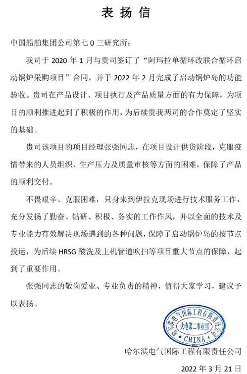 3月21日,中國船舶集團七〇三所收到了一封來自伊拉克項目現(xiàn)場的表揚信,信中對七〇三所設(shè)計供貨的“阿瑪拉單循環(huán)改聯(lián)合循環(huán)啟動鍋爐項目”表示了認可和肯定,也對我所蒸汽動力事業(yè)部專業(yè)技術(shù)人員張強同志冒著疫情風險,遠赴伊拉克參與安裝調(diào)試,保障項目重大節(jié)點順利完成表示了感謝。