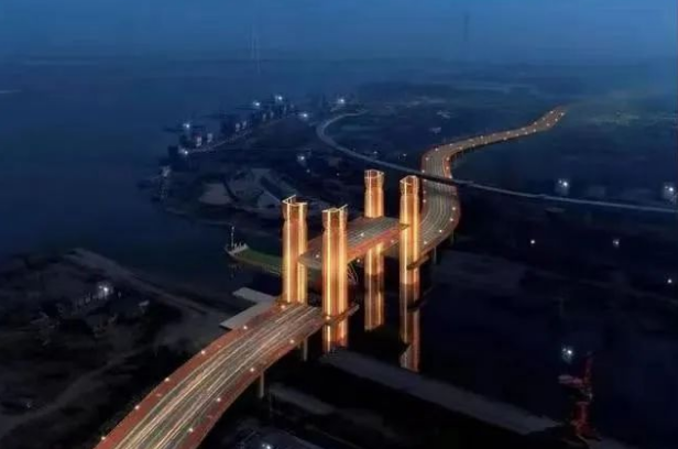 該橋屬于武漢市青山區(qū)右岸大道(建設十一路至焦沙二路)北段工程的項目之一。右岸大道北段工程位于長江以南,西接青山主城區(qū),東連化工區(qū),是實現(xiàn)武鄂同城的重要連接通道。其上跨工業(yè)港運河,由于有通航需求,以及汛期水面上漲因素,因此采用了垂直升降開啟橋的橋型。該橋主跨104米,寬度31米,2650噸重的鋼箱梁由4臺提升系統(tǒng)操作升降,每臺提升系統(tǒng)有2個卷筒,一端懸吊鋼梁,另一端懸吊平衡重。全橋8套平衡重組,分別置于兩端塔樓內。橋面平時距離水面的通航凈空高度8米,最大可提升27米。橋面提升時,就像坐電梯一樣升高。上橋位置安裝了移動護欄,當橋面升起后,有橋梁管理人員對車輛進行有序管控,暫停上橋。