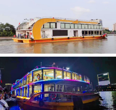 該船是為廣州珠江游打造的豪華雙體游覽船,全鋼制結(jié)構(gòu),配置3015kWh純鋰電池驅(qū)動(dòng),Z形全回轉(zhuǎn)舵槳推進(jìn),設(shè)計(jì)航速為18.5km/h。船體上建采用大面積玻璃幕墻,具有開闊的觀光視野,可提供江景游覽、娛樂餐飲、會議招待等服務(wù)。全船振動(dòng)噪音指標(biāo)優(yōu)良,設(shè)計(jì)建造融入了綠色環(huán)保理念,是取得中國船級社頒發(fā)“綠色船舶-3”入級符號附加標(biāo)志的新能源動(dòng)力船舶。