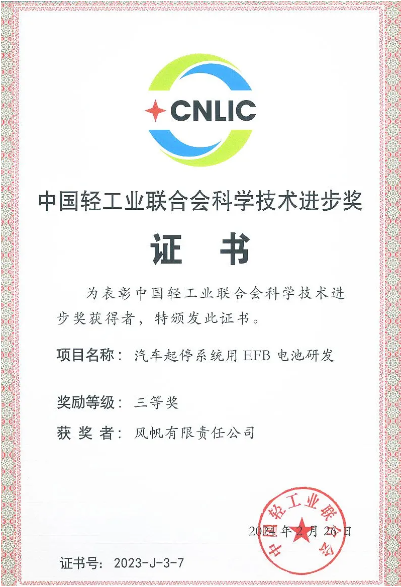 中國(guó)輕工業(yè)聯(lián)合會(huì)科學(xué)技術(shù)進(jìn)步獎(jiǎng)是中國(guó)輕工業(yè)聯(lián)合會(huì)設(shè)立的最高輕工科技獎(jiǎng)項(xiàng),屬于國(guó)家部級(jí)科技獎(jiǎng)勵(lì),被認(rèn)為是輕工業(yè)的“榮譽(yù)勛章”。汽車起停系統(tǒng)用EFB電池項(xiàng)目獲得該項(xiàng)榮譽(yù),是對(duì)風(fēng)帆技術(shù)研發(fā)實(shí)力的充分肯定。