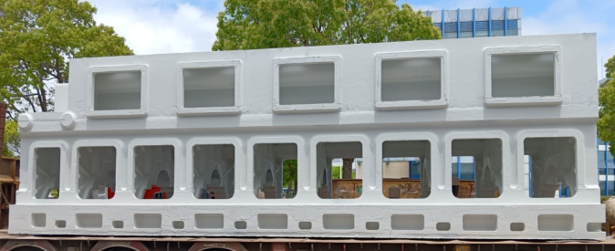 450mm缸徑中速雙燃料發(fā)動(dòng)機(jī)是中船動(dòng)力集團(tuán)自主研制的新一代超大缸徑雙燃料中速發(fā)動(dòng)機(jī),其整體式機(jī)身長(zhǎng)度逾7米,寬度與高度亦超2米,鑄件澆鑄重量達(dá)63噸;鑄造機(jī)身的材質(zhì)質(zhì)量要求極高,鑄件變形控制難度大,對(duì)熔煉環(huán)節(jié)鐵水處理提出了更高要求。