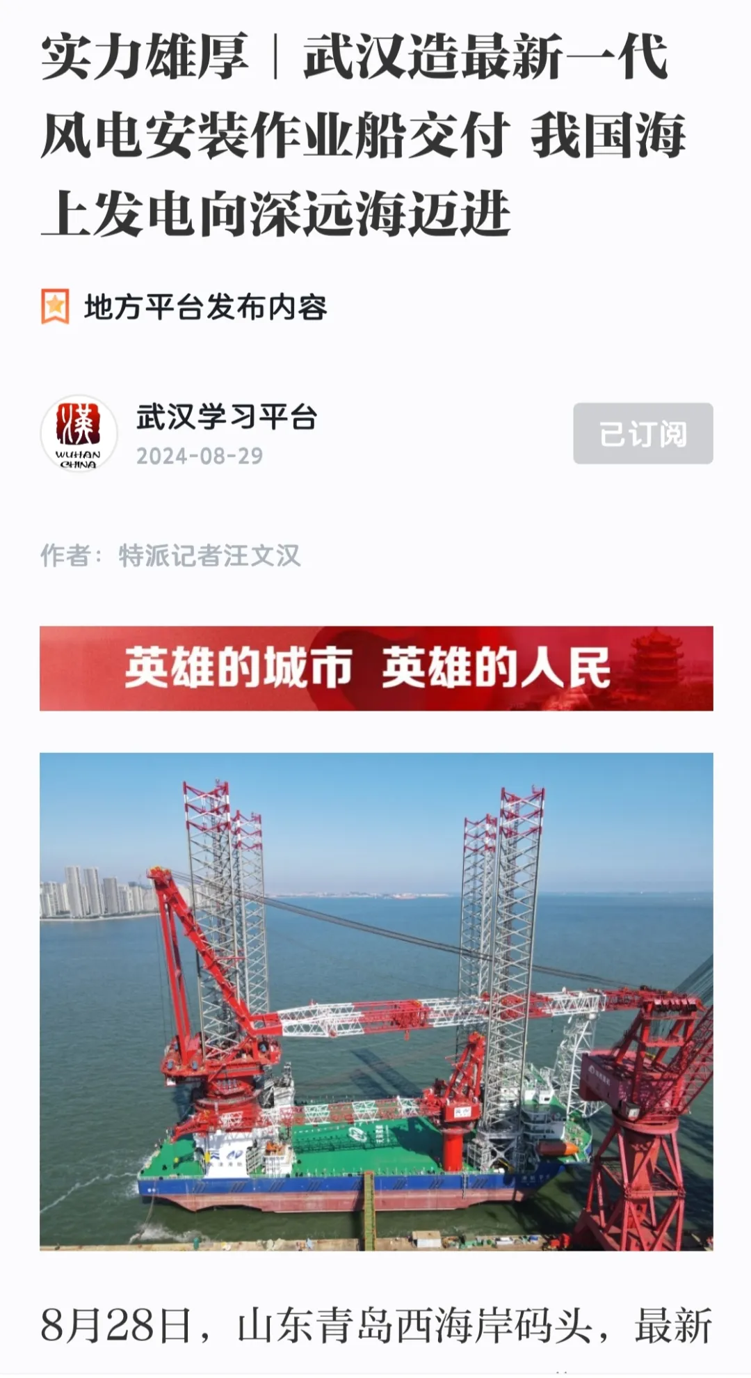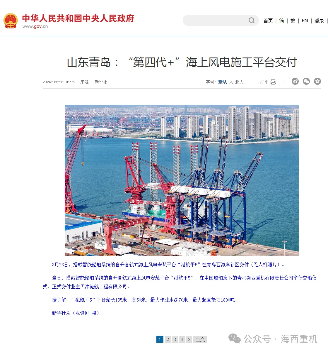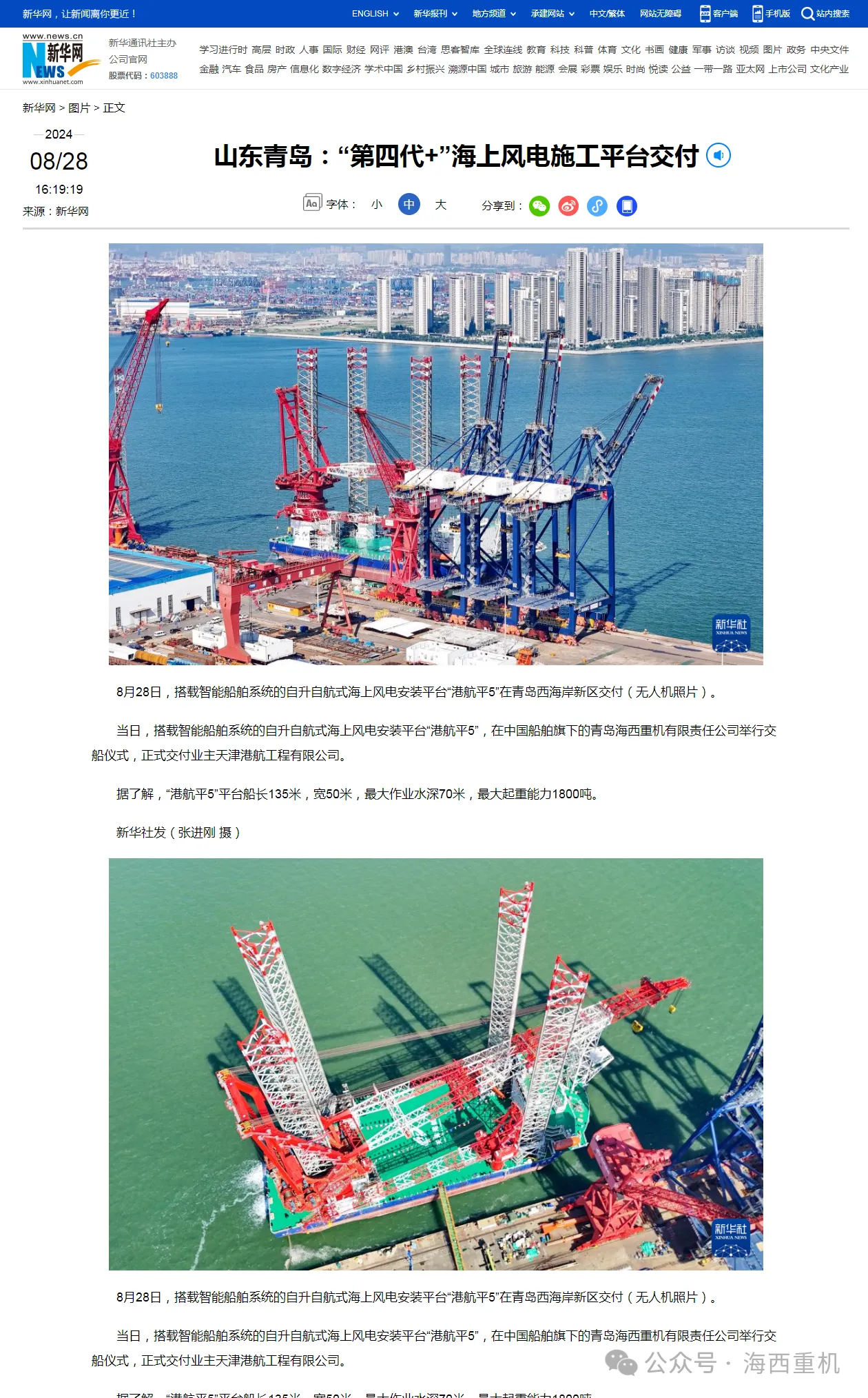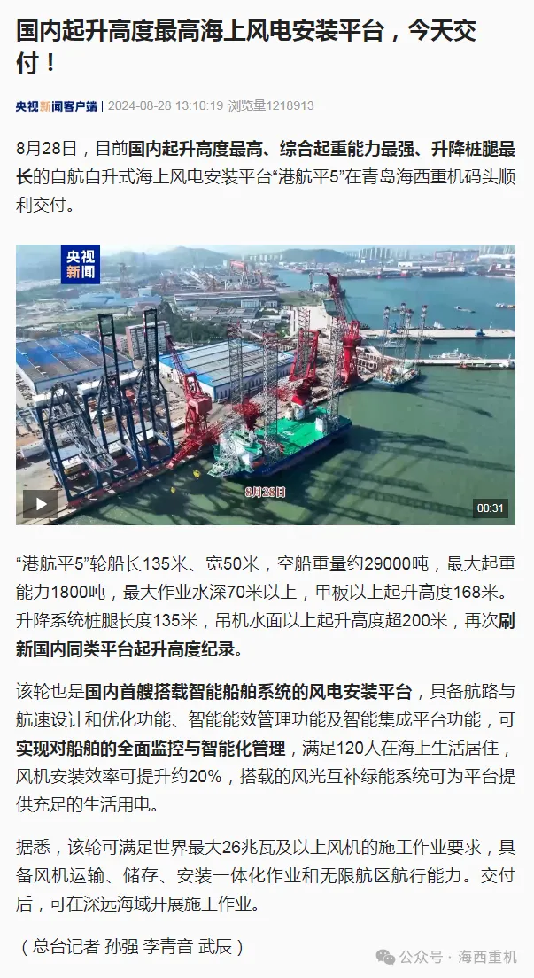8月28日,中國船舶集團旗下中國動力子公司武漢船機牽頭建造的“第四代+”1800噸海上風電安裝平臺“港航平5”在青島海西重機順利交付! 消息一經發(fā)布,就引發(fā)各大媒體關注報道!
