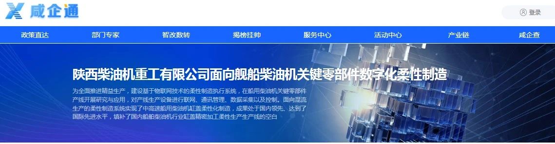 近日,中國(guó)船舶陜柴重工申報(bào)的數(shù)字化典型應(yīng)用場(chǎng)景《基于三維環(huán)境的數(shù)字化工藝設(shè)計(jì)系統(tǒng)》成功入選陜西省2024年數(shù)字化典型應(yīng)用場(chǎng)景名單;《面向JC柴油機(jī)關(guān)鍵零部件數(shù)字化柔性制造》在咸陽(yáng)市委、市政府設(shè)立的綜合性服務(wù)平臺(tái)“咸企通”網(wǎng)站首頁(yè)作為典型案例進(jìn)行展示推廣。