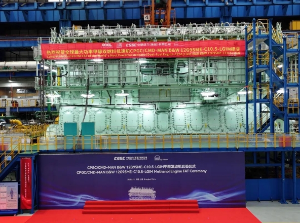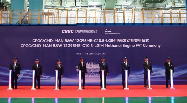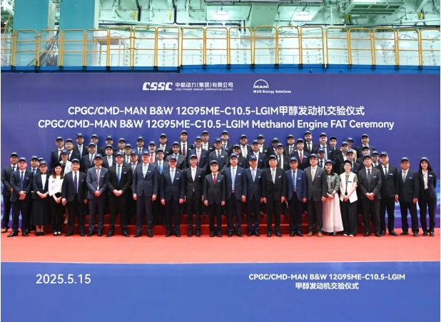 2025年5月15日,中船集團(tuán)下屬中國(guó)動(dòng)力子公司中船動(dòng)力(集團(tuán))有限公司與MAN Energy Solutions(MAN ES)聯(lián)合舉辦的 CPGC/CMD-MAN B&W 12G95ME-C10.5-LGIM-EGRTC 甲醇發(fā)動(dòng)機(jī) FAT 交驗(yàn)儀式在中船動(dòng)力下屬中船三井成功舉行。來(lái)自中國(guó)船舶集團(tuán)有限公司、中遠(yuǎn)海運(yùn)集團(tuán)有限公司、OOCL、ABS船級(jí)社、株式會(huì)社三井E&S、大連華銳重工集團(tuán)股份有限公司等單位的領(lǐng)導(dǎo)、重要客戶與合作伙伴出席儀式。
