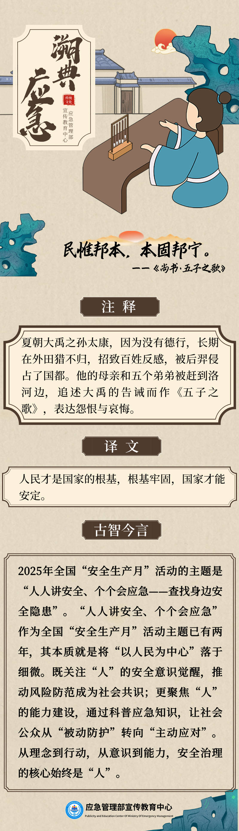 每周與您分享和安全月主題有關(guān)的中國古代應(yīng)急管理智慧,古為今用、推陳出新,在創(chuàng)造性轉(zhuǎn)化和創(chuàng)新性發(fā)展中賡續(xù)中華文脈,本周,我們從“民惟邦本”說起。
