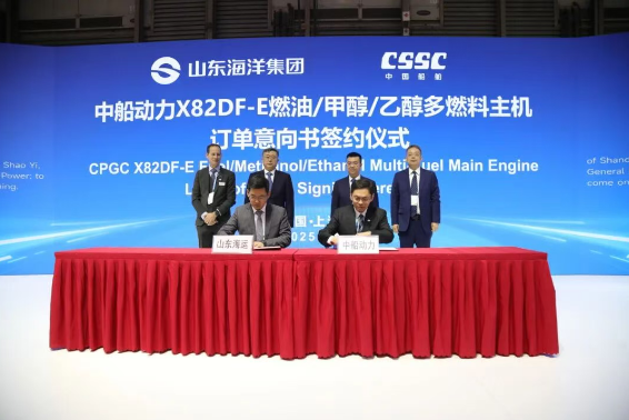 開展首日,中船動力與山東海運舉行X82DF-E燃油/甲醇/乙醇多燃料主機訂單意向書簽約儀式。山東海洋集團有限公司黨委書記、董事長姜國棟,中國船舶集團有限公司黨組成員、副總經理彭原璞出席了儀式,山東海運、中船動力相關領導共同參加本次簽約儀式。山東海洋集團副總經理、山東海運黨委書記、董事長高長峰與中船動力總經理、黨委副書記邵煜代表雙方簽署了多燃料主機訂單意向書。
