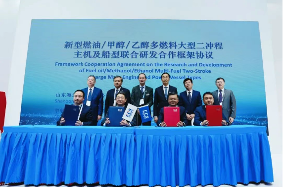 同時,山東海運股份有限公司、中國船級社、中船動力(集團)有限公司、WinGD四家單位聯合簽署《新型燃油/甲醇/乙醇多燃料大型二沖程主機及船型研發(fā)聯合開發(fā)合作協議》。助力我國“雙碳”目標與可持續(xù)發(fā)展戰(zhàn)略落地,為“海洋強國”、“交通強國”建設筑牢技術與產業(yè)根基,助力支持全球海事的可持續(xù)發(fā)展。