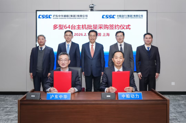 2月11日,滬東中華與中國動力子公司中船動力成功簽訂多型64臺主機(jī)批量采購協(xié)議。滬東中華領(lǐng)導(dǎo)班子成員陳建良、翁紅兵、鄭豪、宋煒,中船動力領(lǐng)導(dǎo)班子成員邵煜、張仲領(lǐng)、姜泉出席簽約儀式。本次采購的主機(jī)以綠色雙燃料機(jī)型為主,標(biāo)志雙方在推動船舶動力綠色轉(zhuǎn)型方面邁出關(guān)鍵一步。