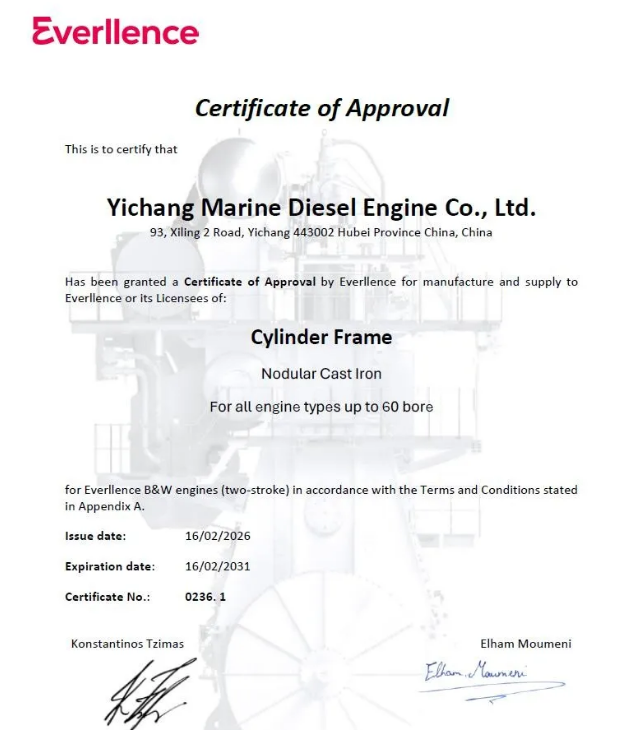 日前,中國動力下屬中船宜柴公司收到Everllence專利公司頒發(fā)的600mm以下缸徑球墨鑄鐵氣缸體生產(chǎn)認可證書。至此,宜柴公司已取得船用低速機三大關(guān)重件——缸體、缸套、中間體的全部生產(chǎn)認可證書。