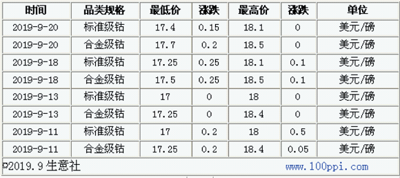 由表可以看出,MB鈷價穩(wěn)中有升,國際鈷價大幅上漲,帶動國內(nèi)鈷價上漲。截止9月20日,MB鈷價報價17.7-18.5美元/磅,國際鈷價穩(wěn)步上漲,對國內(nèi)鈷價有利好影響,促進國內(nèi)鈷價上漲。