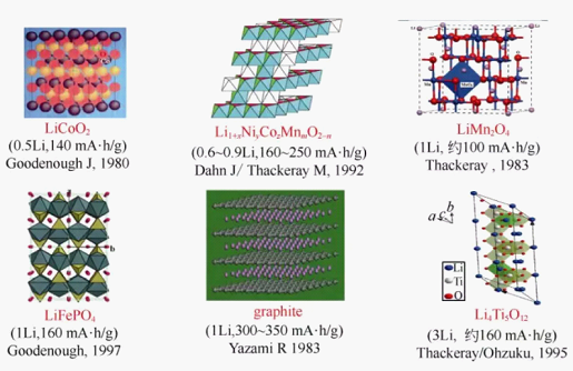 商業(yè)鋰離子電池正負(fù)極材料的示意圖、主要發(fā)明人、發(fā)明時間