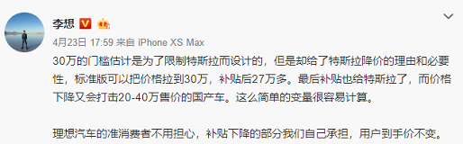理想汽車CEO李想在微博中直言,“30萬元的門檻估計(jì)是為了限制特斯拉而設(shè)計(jì)的,但是卻給了特斯拉降價(jià)的理由和必要性?!毙※i汽車董事長何小鵬亦預(yù)判,“年內(nèi)Model3長續(xù)航版會(huì)降價(jià)到27.75萬”。