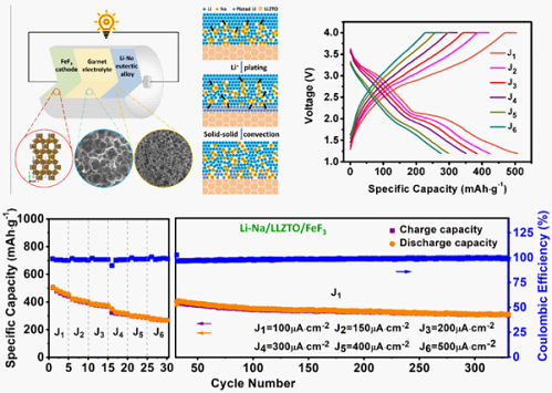 Li-Na/LLZO/FeF3固態(tài)電池構(gòu)架,共晶合金固-固對流示意圖,Li-Na/LLZO/FeF3電池的倍率和循環(huán)性能