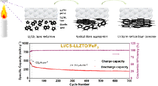 該團(tuán)隊(duì)提出“燭焰(candle soot)燒烤陶瓷”模式改性LLZO/Li界面的策略,顯著剪薄了陶瓷表面的鈍化層,實(shí)現(xiàn)了“轉(zhuǎn)換型”鋰氟化物固態(tài)電池的超長可逆循環(huán)。LLZO在與空氣接觸后,易與空氣中的水和二氧化碳反應(yīng),在表面形成包含LiOH和Li2CO3的鈍化層,這一鈍化層嚴(yán)重影響了Li與LLZO的接觸,阻斷了界面處的鋰離子傳輸通道,導(dǎo)致電池的界面阻抗過大,電池性能嚴(yán)重受限。因此,鈍化層的去除是目前LLZO/Li界面改性研究的重要方向之一。在此背景下,該團(tuán)隊(duì)提出一種簡易的蠟燭火焰氣相沉積手段,在蠟燭燃燒產(chǎn)生的高溫環(huán)境下,LLZO表面的Li2CO3鈍化層可以被表面沉積的蠟燭煤煙還原,具有多晶石墨化結(jié)構(gòu)的煤煙炭黑層在鋰化后可生成LiC6晶域,具有離子/電子混合導(dǎo)電性,有利于鋰離子流在界面中間層的高通量傳輸。這種界面改性后的Li/CS-LLZO/FeF3固態(tài)電池表現(xiàn)出優(yōu)異的長循環(huán)和倍率性能,其初始可逆容量可達(dá)500 mAh·g-1,循環(huán)壽命長達(dá)至少1500圈,在200 μA·cm-2電流密度下循環(huán)700圈后的可逆容量依然維持在201.0 mAh·g-1。陶瓷基固態(tài)Li-FeF3電池的循環(huán)性能甚至可超過文獻(xiàn)報(bào)道的液態(tài)Li-FeF3體系。相關(guān)成果發(fā)表于ACS Applied Materials & Interfaces。