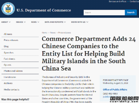 8月26日,美國商務部網(wǎng)站發(fā)布新聞稿稱,商務部產(chǎn)業(yè)安全局將24家中國企業(yè)列入美國實體清單,原因是這些企業(yè)“幫助中國軍方在南海修建人工島”。