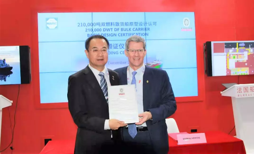 12月4日,法國船級(jí)社為中國船舶集團(tuán)七〇八所簽發(fā)21萬噸雙燃料散貨船初步認(rèn)可證書。