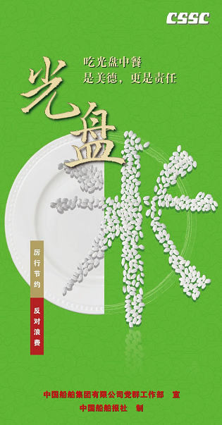 為認(rèn)真貫徹落實(shí)習(xí)近平總書記關(guān)于制止餐飲浪費(fèi)行為的重要指示精神,大力弘揚(yáng)中華民族勤儉節(jié)約、珍惜糧食的文明用餐習(xí)慣,中國(guó)船舶集團(tuán)積極開展“制止餐飲浪費(fèi) 踐行光盤行動(dòng)”專項(xiàng)宣傳引導(dǎo)活動(dòng)。