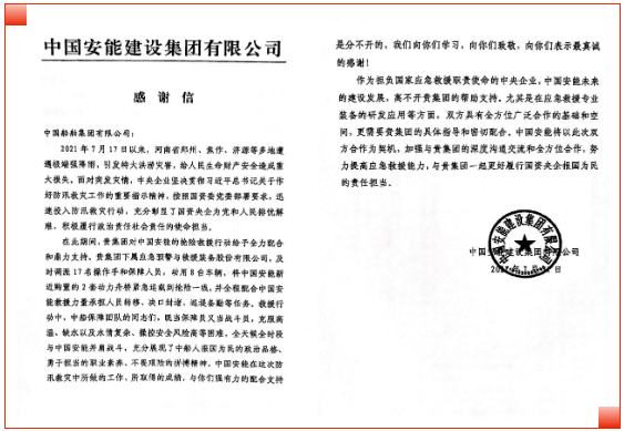 近日,擔(dān)負(fù)國(guó)家應(yīng)急救援職責(zé)使命的中國(guó)安能建設(shè)集團(tuán)有限公司發(fā)來(lái)一封感謝信。