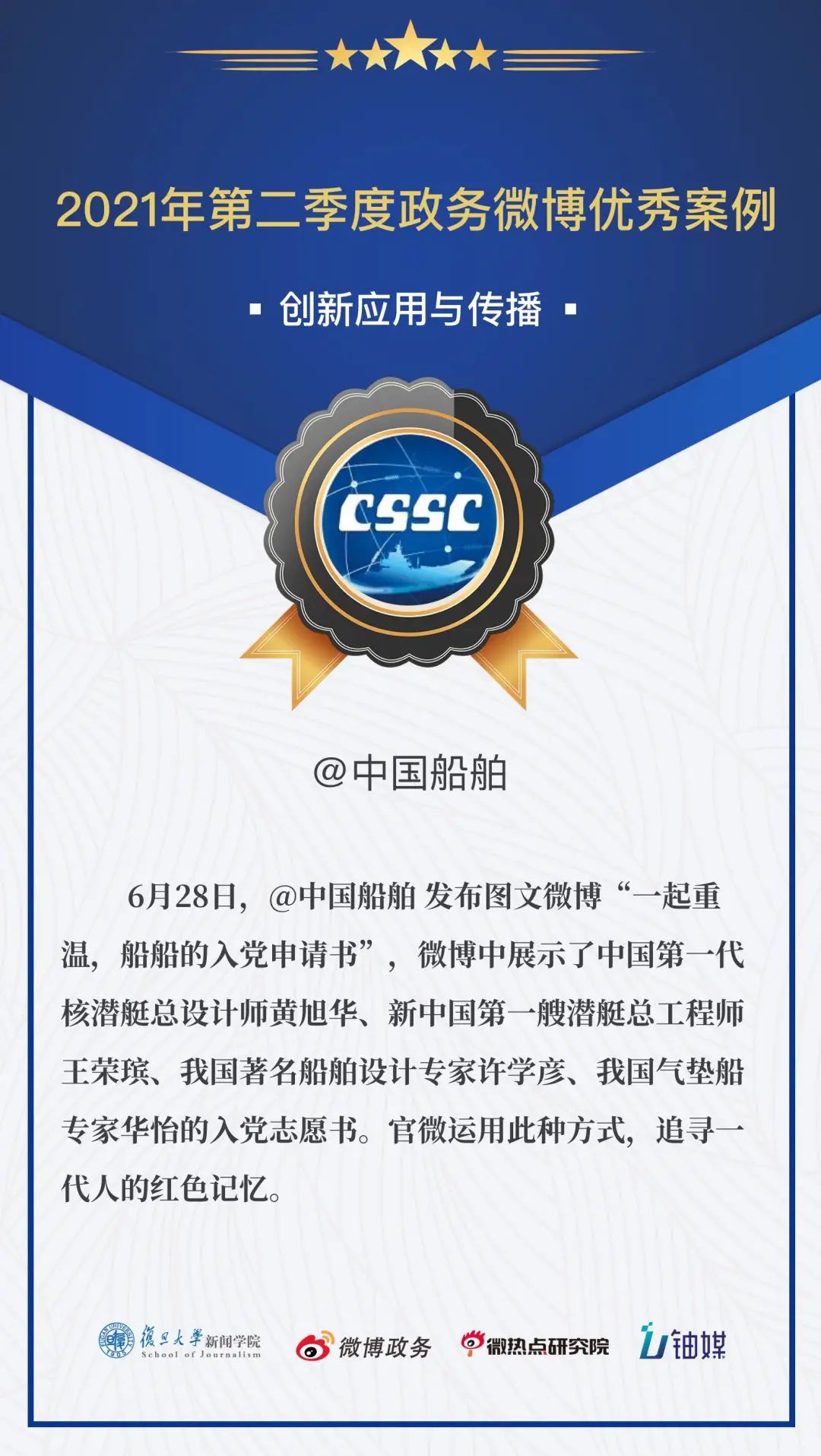在幾百個微博政務賬號、幾千個微博政務優(yōu)秀案例的評選中,@中國船舶 憑借圖文微博“一起重溫,船船的入黨申請書”,再一次拿下“創(chuàng)新應用與傳播”的獎勵,真的是太棒了!