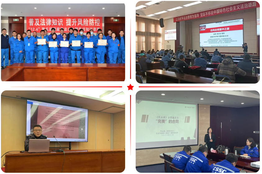 ▲ 江南造船、中船九院、重齒公司、河柴重工、江淮重工、七〇八所、七〇九所、七一六所等單位通過(guò)線上與線下相結(jié)合的方式開(kāi)展法律知識(shí)競(jìng)賽;七一七所、七二二所等單位拍攝制作普法微視頻;中船澄西、中船財(cái)務(wù)、中船投資、物資公司、各平臺(tái)型上市公司、中船綠洲、中船風(fēng)電、漢光重工、長(zhǎng)江科技、七一〇所、七一一所、上船院等多家單位舉辦專(zhuān)題法治講座;七六〇所舉辦民法典熱點(diǎn)問(wèn)題交流沙龍;八院組織業(yè)務(wù)部門(mén)重點(diǎn)崗位人員旁聽(tīng)庭審。