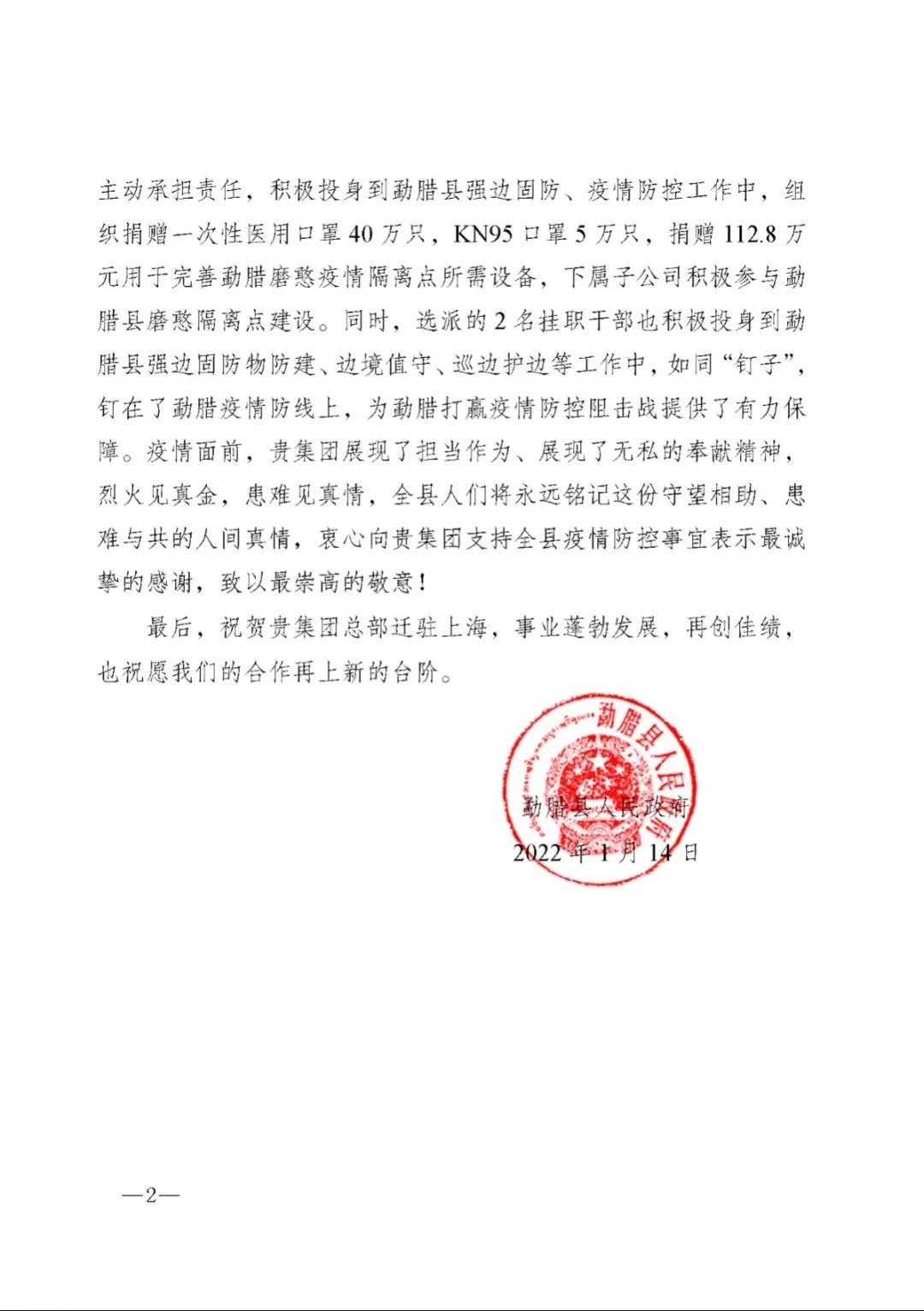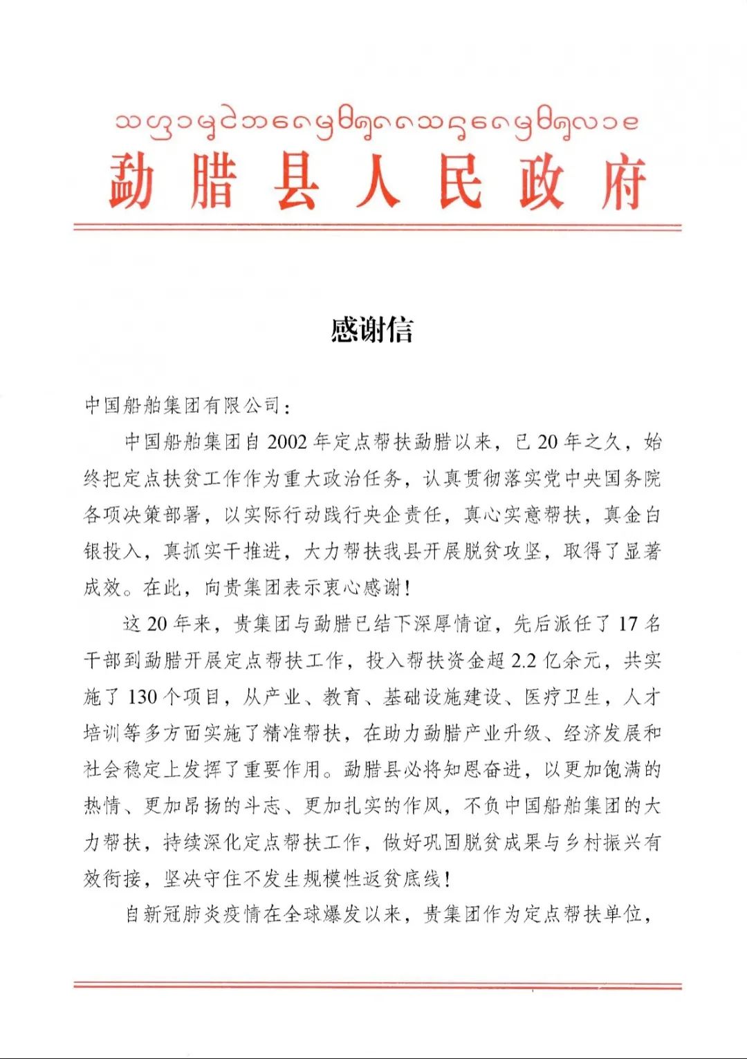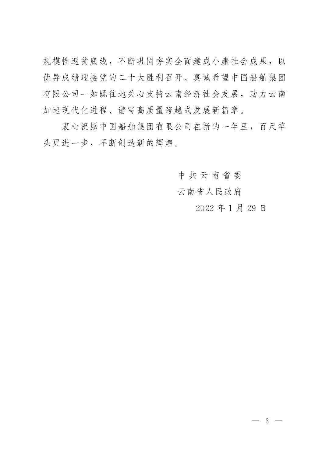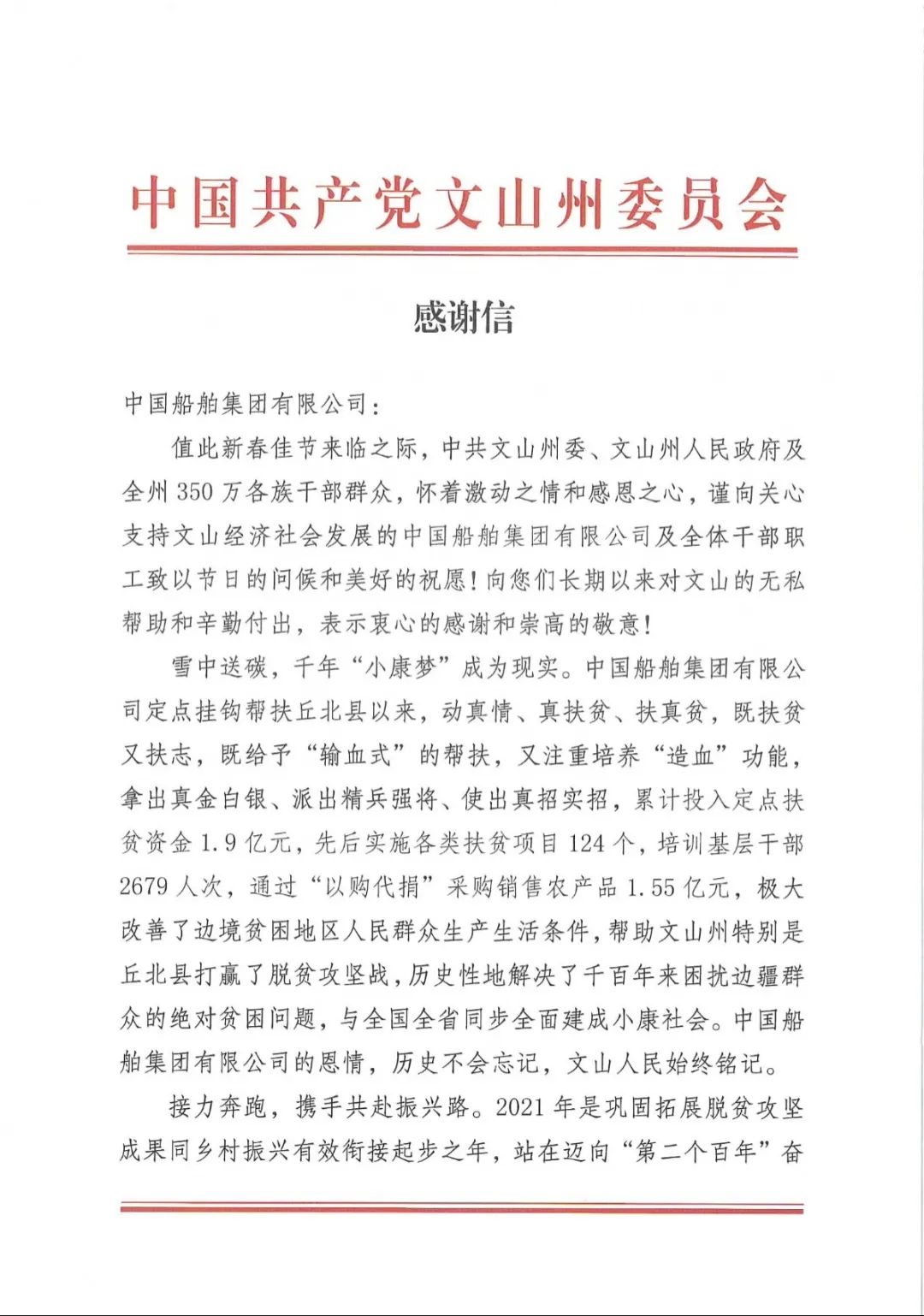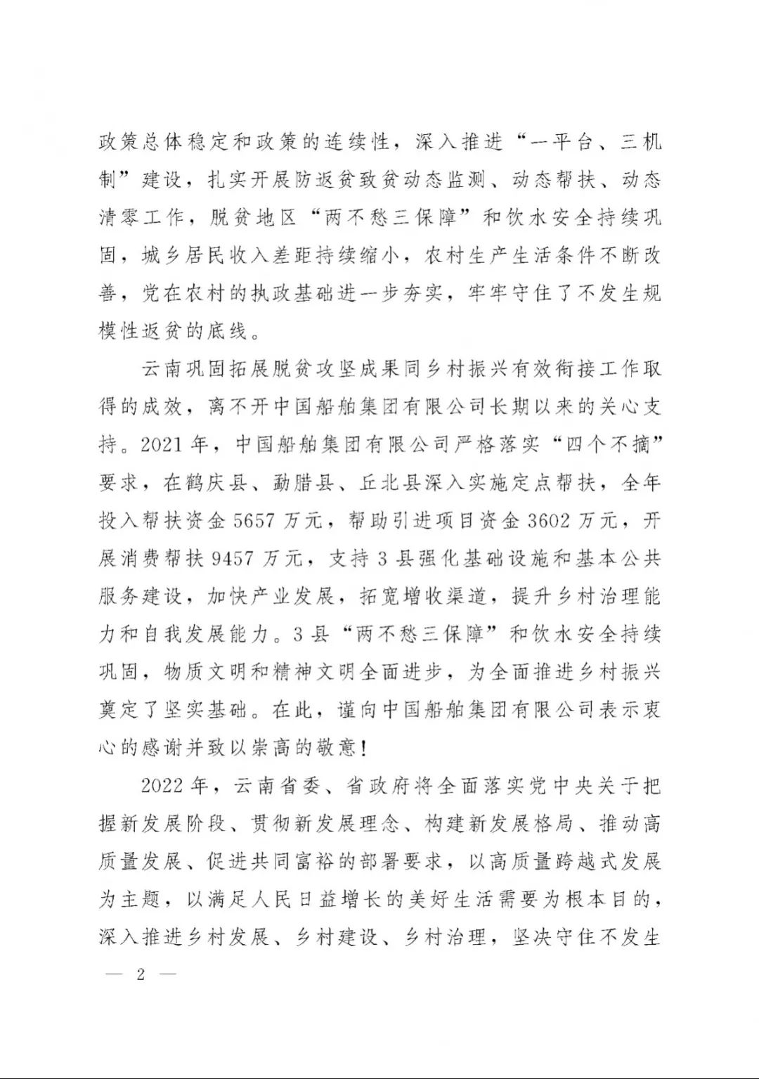 春節(jié)前夕,中國船舶集團陸續(xù)收到云南省委省政府、文山州委州政府、鶴慶縣委縣政府、勐臘縣政府發(fā)來的感謝信,對集團公司長期以來給予鶴慶縣、勐臘縣、丘北縣的傾力幫扶表示衷心感謝和崇高敬意。