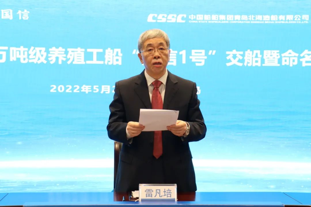 5月20日,中國(guó)船舶集團(tuán)旗下青島北海造船有限公司為青島國(guó)信發(fā)展(集團(tuán))有限責(zé)任公司建造的全球首艘10萬(wàn)噸級(jí)智慧漁業(yè)大型養(yǎng)殖工船“國(guó)信1號(hào)”交船命名儀式在青島舉行。中國(guó)船舶集團(tuán)黨組書(shū)記、董事長(zhǎng)雷凡培,黨組成員、副總經(jīng)理孫偉通過(guò)視頻出席儀式,山東省人民政府黨組成員、副省長(zhǎng)凌文,青島市委副書(shū)記、市長(zhǎng)趙豪志,中國(guó)海洋大學(xué)黨委副書(shū)記、校長(zhǎng)于志剛,中國(guó)工程院院士麥康森等領(lǐng)導(dǎo)和嘉賓出席儀式。青島市副市長(zhǎng)趙燕為新船命名。