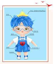 設(shè)計說明:圍繞“愛在深藍”志愿服務(wù)為主題設(shè)計了一名小男孩IP形象,深藍色的發(fā)色呼應(yīng)主題。紅色的帽子和三角巾突出志愿服務(wù)的形象與船舶青年熱血有愛志愿精神。雪白的T恤在胸口印有“愛在深藍”品牌LOGO,彰顯小男孩的身份與純潔進步的“艦船報國、向海圖強”的船舶青年志向??蓯矍疑珘K明顯的IP形象設(shè)計,通過紅藍撞色使IP形象更具有吸引力。小男孩形象設(shè)計簡潔,方便進行后期表情包、日歷、書簽等2D周邊設(shè)計,與3D實物生產(chǎn)。