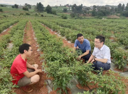 ▲洪術(shù)華(右一)在種植基地查看辣椒長(zhǎng)勢(shì)