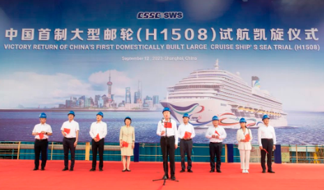 現(xiàn)場舉行了簡短的歡迎儀式。溫剛宣布中國首制大型郵輪完工試航所有驗證項目全部達(dá)標(biāo),試航任務(wù)圓滿完成。