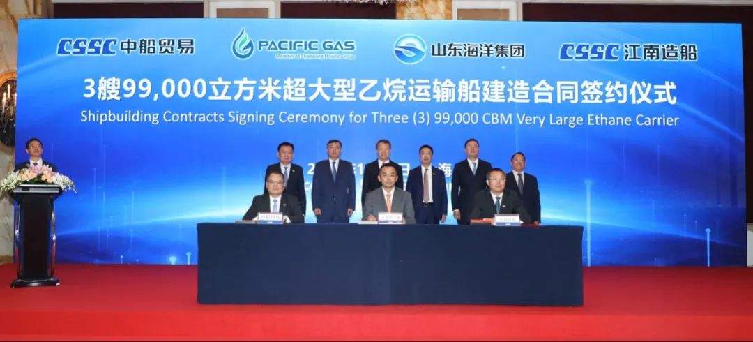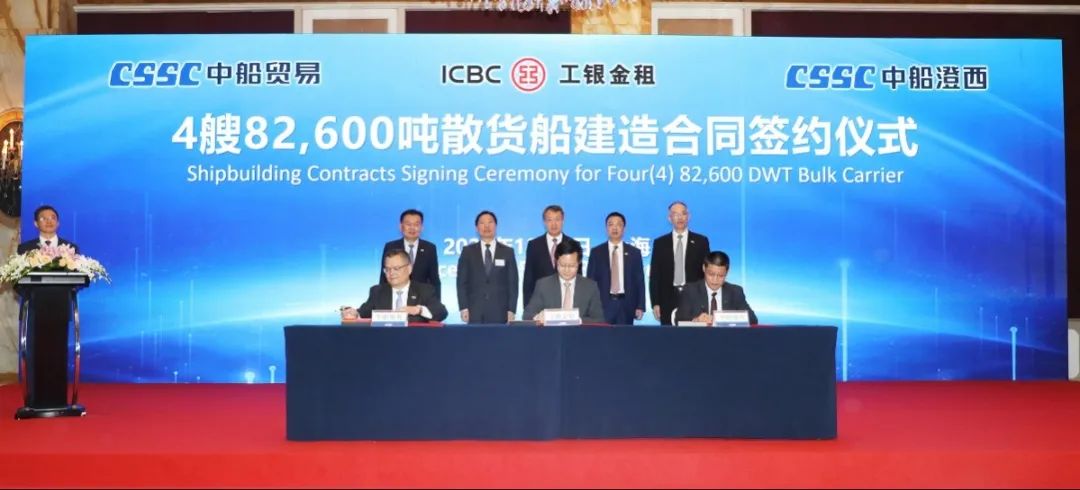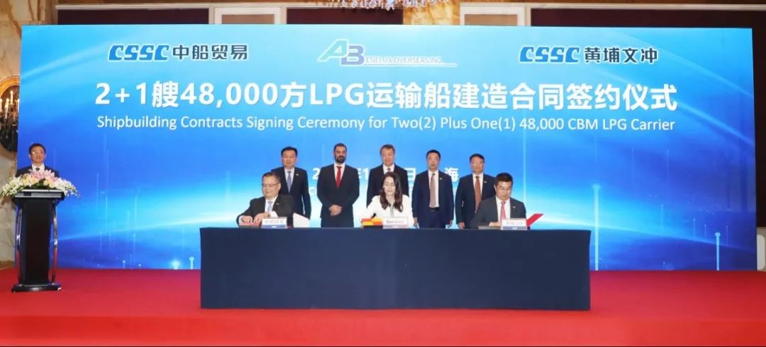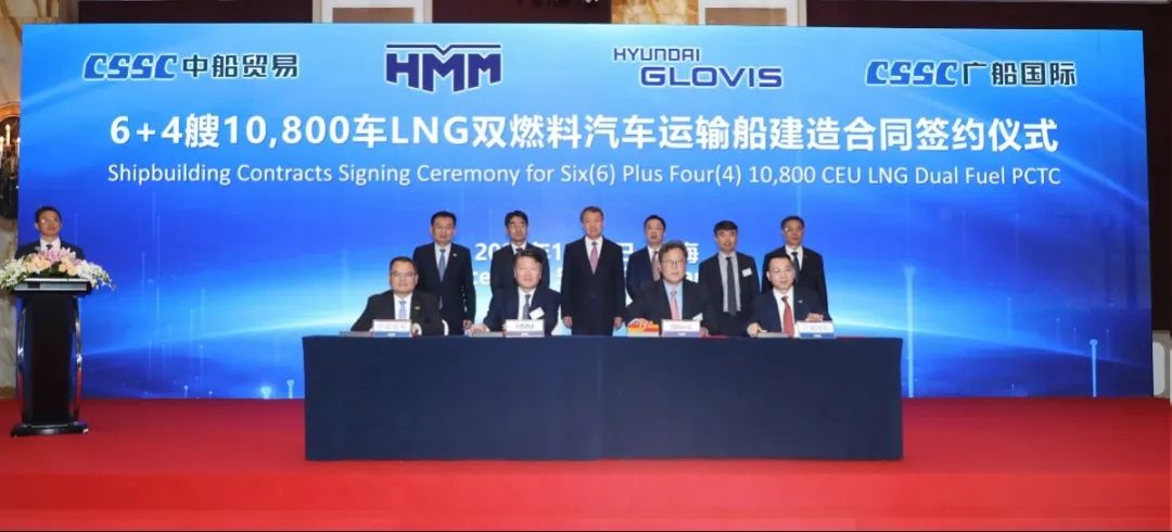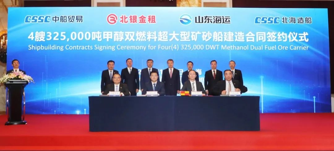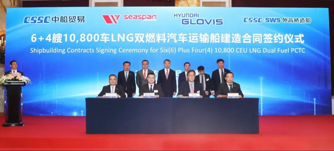 簽約儀式上,外高橋造船、中船貿(mào)易與Seaspan、現(xiàn)代Glovis簽署了6+4艘10800車LNG雙燃料PCTC船項(xiàng)目;廣船國際、中船貿(mào)易與HMM、現(xiàn)代Glovis簽署了6+4艘10800車LNG雙燃料PCTC船項(xiàng)目;北海造船、中船貿(mào)易與北銀金租、山東海運(yùn)簽署了4艘325000噸超?型甲醇雙燃料礦砂船項(xiàng)目;江南造船、中船貿(mào)易與太平洋氣體簽署了3艘99000方VLEC船項(xiàng)目;黃埔文沖、中船貿(mào)易與Benelux公司簽署了2+1艘48000方LPG船項(xiàng)目;中船澄西、中船貿(mào)易與工銀金租簽署了4艘82600噸散貨船項(xiàng)目;大連造船與七二五所青島雙瑞簽署了15000TEU集裝箱船甲醇供應(yīng)系統(tǒng)項(xiàng)目。