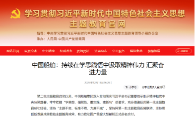12月18日,學習貫徹習近平新時代中國特色社會主義思想主題教育官網(wǎng)發(fā)布《中國船舶:持續(xù)在學思踐悟中汲取精神偉力 匯聚奮進力量》。中國船舶集團通過繪好“施工圖”、念好“三字經(jīng)”、用好“五字訣”等扎實開展好主題教育,切實以主題教育成果推動集團公司加快建設世界一流船舶集團。