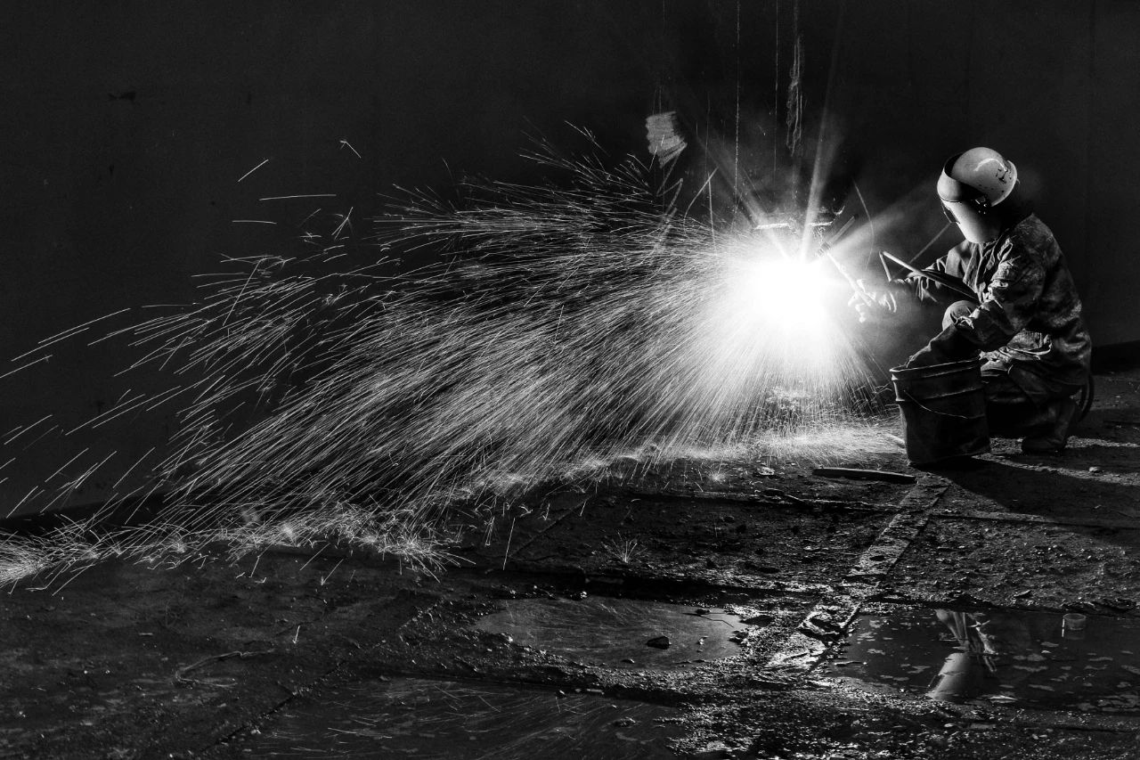 利用慢門記錄造船工人在氣刨時(shí)的工作場面。