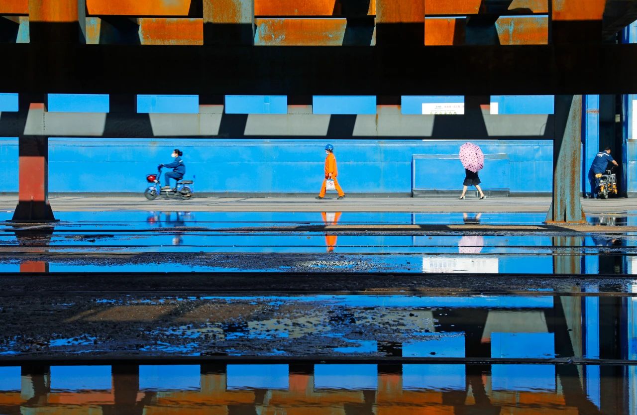 夏日清晨,一場(chǎng)大雨過后空氣透亮清新,廠區(qū)高跨門口服裝各異的職工行走在上班的路上,空地上擺放的工裝架與其自身的投影形成了獨(dú)特的畫框,讓畫面中行走的職工雖小卻很突出,起重工亮橙色的服裝、撐起的雨傘與明亮的藍(lán)色跨門形成色彩對(duì)比,使畫面活潑跳躍,職工們形形色色又從容有序,勾勒出廠區(qū)一隅的美麗風(fēng)景。