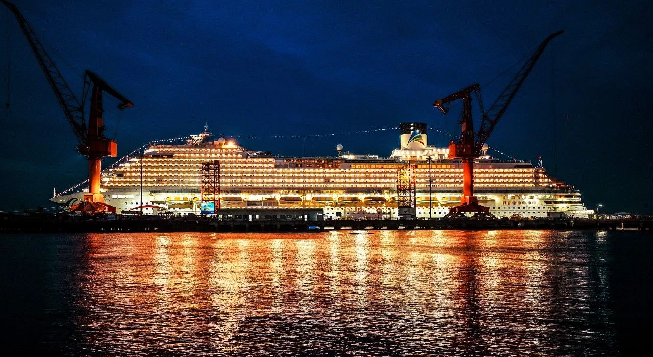國(guó)產(chǎn)首艘國(guó)產(chǎn)大型郵輪“愛達(dá)·魔都號(hào)”,??吭陂L(zhǎng)江口,燈光電路測(cè)試期間,華燈綻放恍如白晝。