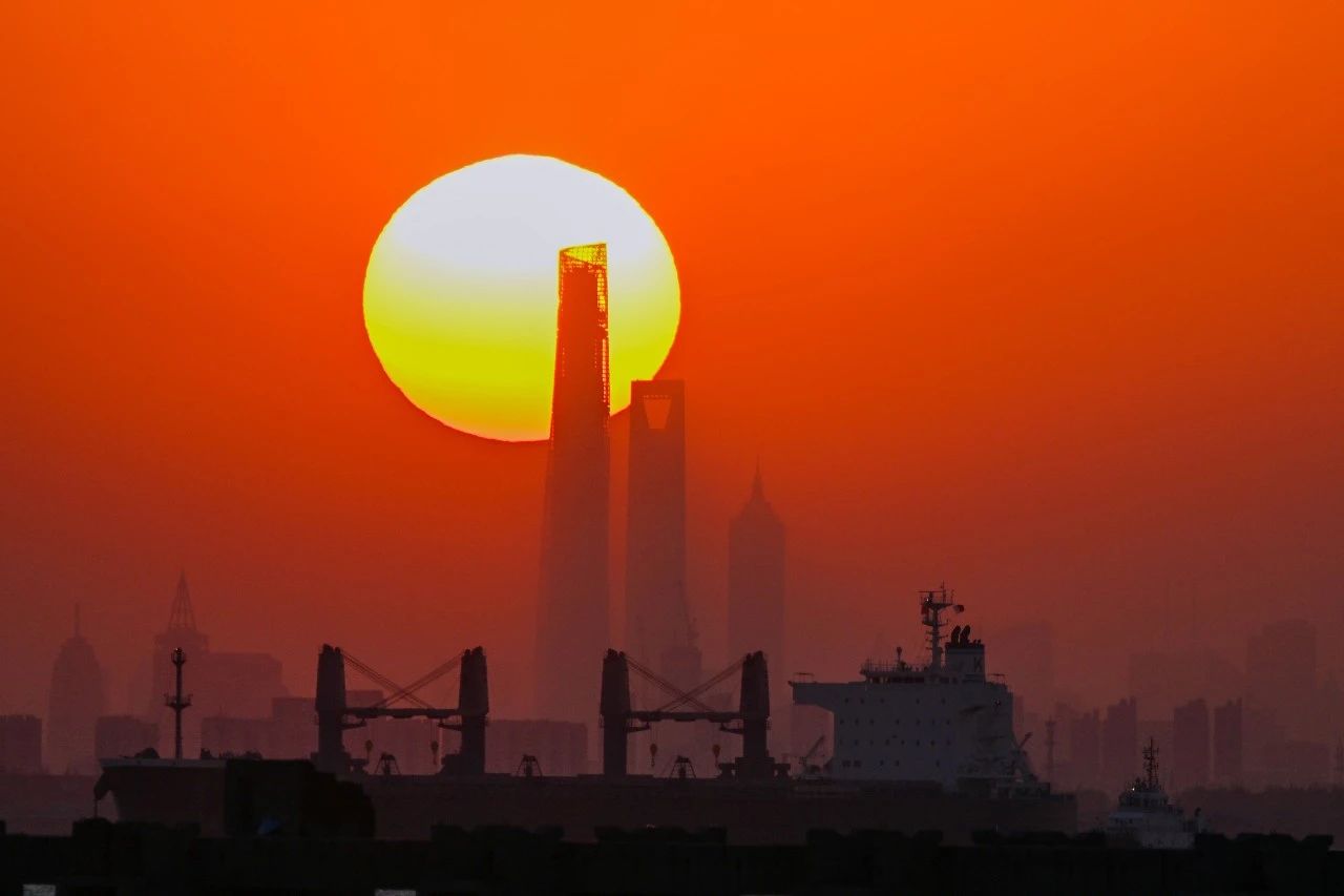 從距離陸家嘴33公里遠(yuǎn)的橫沙島上遠(yuǎn)眺“三件套”,夕陽從“三件套”穿過,此時(shí)一艘船駛?cè)氘嬅?,與夕陽形成近中遠(yuǎn)三景。