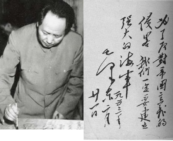 1953年,毛澤東同志視察“長江”艦,在艦上揮毫寫下“為了反對帝國主義的侵略,我們一定要建立強大的海軍”。