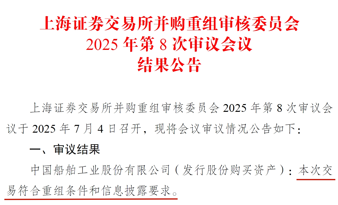 7月4日,上海證券交易所并購重組審核委員會2025年第8次審議會議召開,審議結(jié)果為中國船舶工業(yè)股份有限公司(發(fā)行股份購買資產(chǎn)):本次交易符合重組條件和信息披露要求。