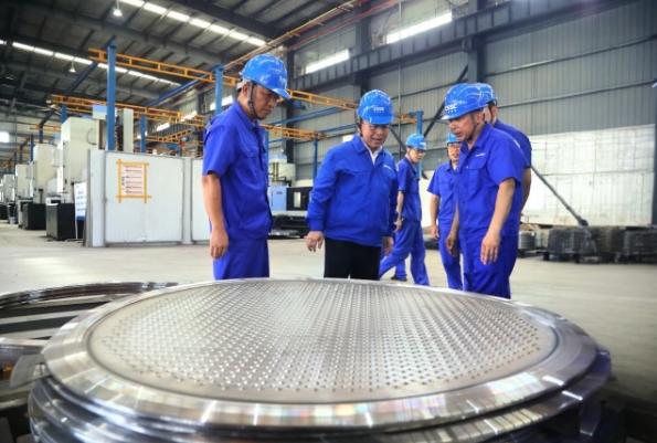 王國強深入科研生產(chǎn)一線,調(diào)研了相關(guān)車間、實驗室、勞模創(chuàng)新工作室,察看了智能制造中心、重點產(chǎn)品、相關(guān)技術(shù)進展;慰問了勞模工匠、一線員工,與他們就現(xiàn)場管理看板優(yōu)化、工藝改善等交流互動,勉勵他們健康生活、快樂工作,叮囑相關(guān)單位負責人要做好防暑降溫工作;聽取了相關(guān)二級管理單位生產(chǎn)經(jīng)營、深化改革、科技創(chuàng)新、人才培養(yǎng)、黨的建設等方面情況匯報。