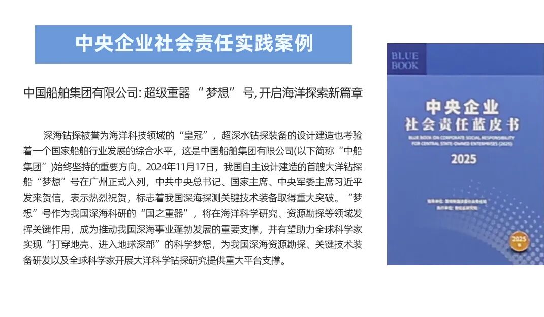 中船集團(tuán)申報(bào)的《超級(jí)重器“夢(mèng)想”號(hào),開啟海洋探索新篇章》,聚焦國(guó)之重器建造歷程,闡述了“夢(mèng)想”號(hào)在海洋科學(xué)研究、深海資源勘探等領(lǐng)域的關(guān)鍵作用,成功入選《中央企業(yè)社會(huì)責(zé)任藍(lán)皮書(2025)》中央企業(yè)社會(huì)責(zé)任實(shí)踐案例。