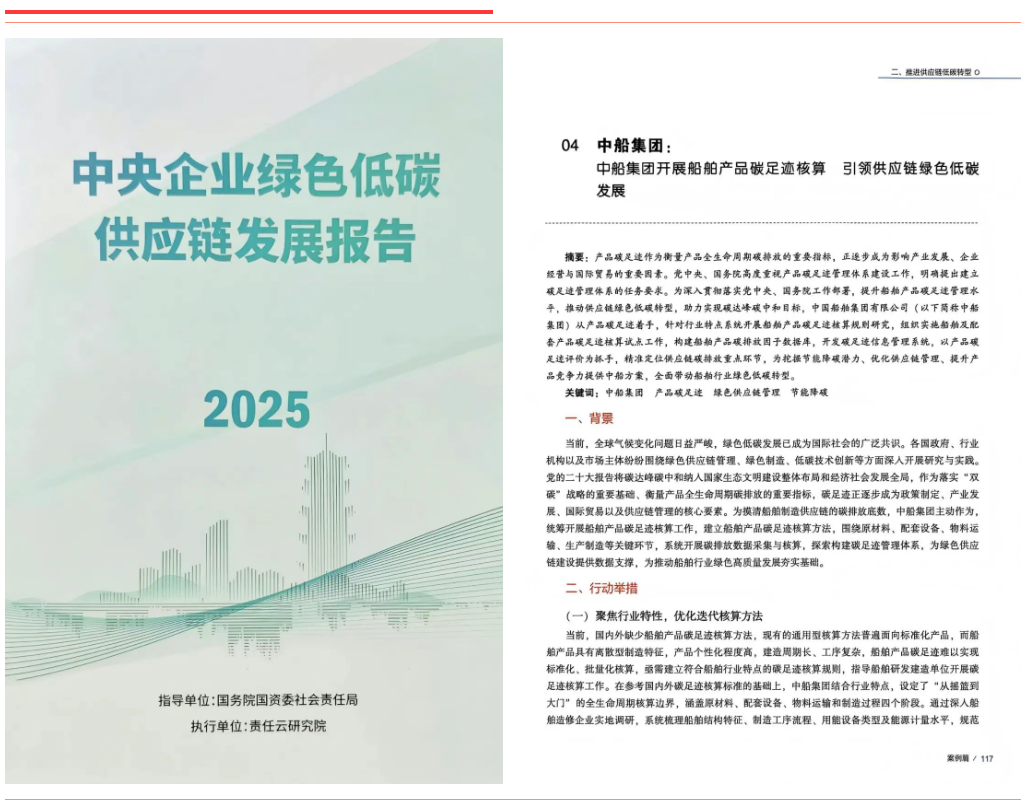 近日,在《聯(lián)合國氣候變化框架公約》第三十次締約方大會(COP30)“中國角”——“‘雙碳’目標下央企綠色低碳行動實踐”主題邊會上,國務(wù)院國資委發(fā)布《中央企業(yè)綠色可持續(xù)發(fā)展優(yōu)秀實踐案例集(2025)》《中央企業(yè)綠色低碳供應(yīng)鏈發(fā)展報告(2025)》,中船集團3項優(yōu)秀案例成功入選。