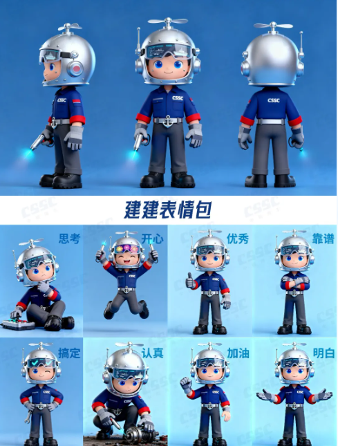 建建(造船擔(dān)當(dāng))以銀色防護(hù)頭盔(嵌船舶零件電子屏、印艦船剪影)、船錨腰帶、CSSC工裝及焊槍,凸顯造船匠心精神;航航(航行擔(dān)當(dāng))憑船舵頭飾、導(dǎo)航羅盤、海鷗披風(fēng)與船錨上衣,傳遞中船航行使命。二者以 “建造 - 航行” 閉環(huán),具象中船全鏈條實(shí)力,彰顯中船文化。