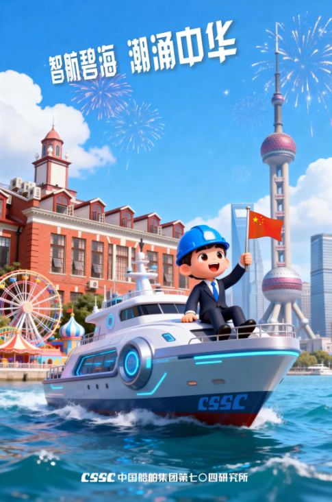 海報(bào)以七〇四所標(biāo)志性建筑“小紅樓”和上海市地標(biāo)為背景,AI 生成的卡通工程師乘坐智能船舶破浪前行,手持國旗彰顯科技自信。
