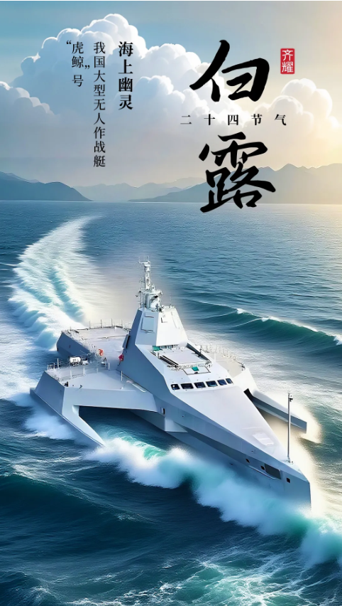 該海報(bào)以即夢(mèng)AI為筆,繪就了一場(chǎng)跨越時(shí)空的對(duì)話,將“白露”的清冷賦予“海上幽靈”無人艇的鋒芒。
